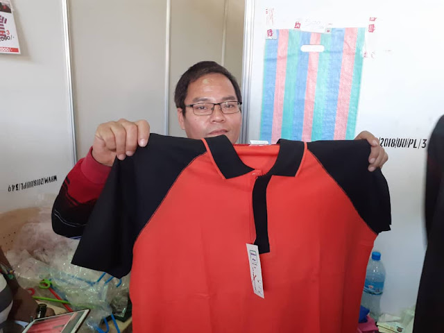 Shoma Darlami akiwa ameshika fulana ambayo imenunuliwa na moja ya wateja waliofika katika banda la A to Z katika maonesho ya biashara Sabasaba jijini Dar es Salaam