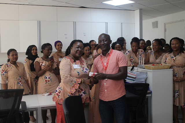Airtel Divas Meneja uhusiano Airtel Bi, Dangio Kaniki akitoa zawadi kwa Edward Mtingwa kwa lengo la kuwashukuru wanaume wote wanaofanya kazi nao. ‘Airtel Divas’ leo wameadhimisha siku ya wanawake Duniani yenye kauli mbiu ‘Balance for better’ kwa kutoa shukrani kw wanaume wote. Siku ya wanawake huadhimishwa kila mwaka tarehe 08 Machi ikiwa na lengo la kutambua mchango wa wanawake katika jamii