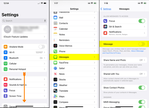 To ensure texting works as it should on your new phone, head into the Settings section of your old phone, scroll down and tap on Messages, then toggle the iMessage slider off.