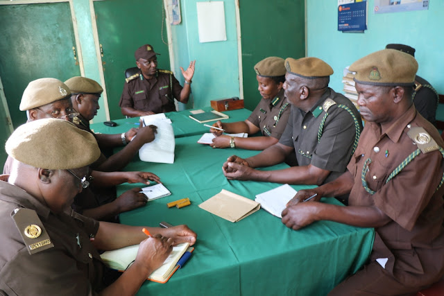 Mkuu wa Jeshi la Magereza nchini – CGP Phaustine Kasike(meza kuu) akiongoza kikao kazi na Maafisa wa Magereza Mkoani Manyara kabla ya kufanya Baraza la Wafungwa na mahabusu wa Gereza Babati.