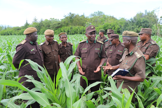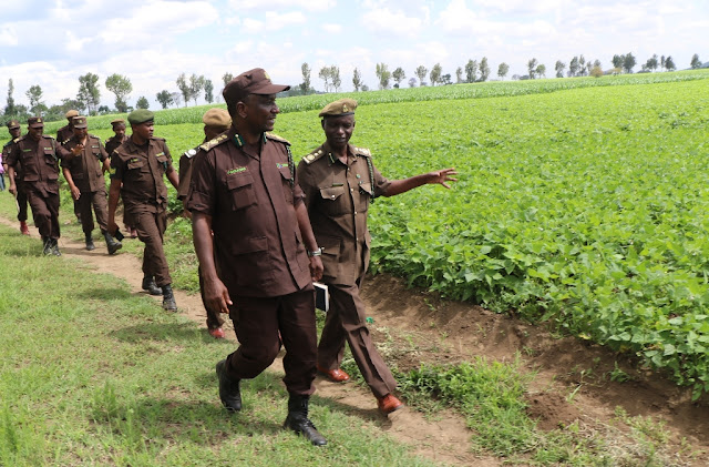 Mkuu wa Jeshi la Magereza nchini – CGP Phaustine Kasike(wa pili toka kulia) akitoa maelekezo kwa Mkuu wa Magereza Mkoani Arusha, Kamishna Msaidizi wa Magereza, Anderson Kamtiaro(kulia)alipokagua Shamba la mahindi kabla ya kuendelea na ziara ya kikazi Mkoani Manyara leo Novemba 16, 2019(Picha zote na Jeshi la Magereza).