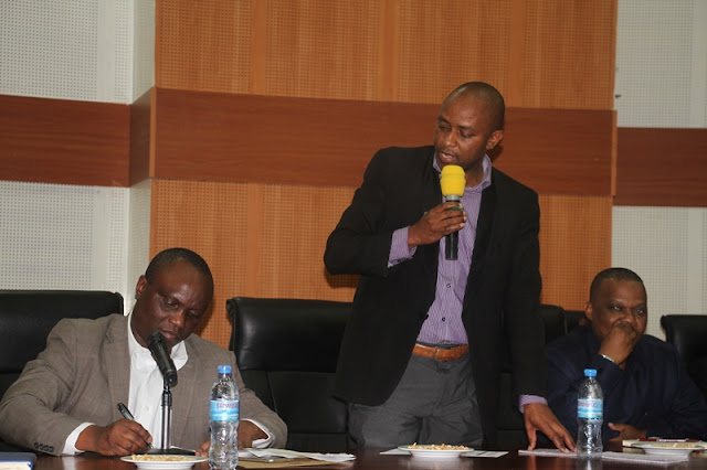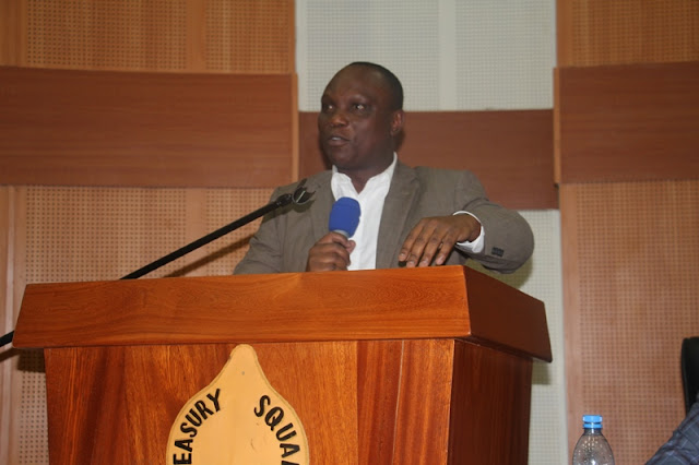 Mwakilishi wa Kamishna wa Bajeti Bw. Sigsbert Kavishe akichangia hoja katika wa kikao na Watumishi wa Wizara ya Fedha na Mipango, kushoto ni Naibu Katibu Mkuu wa Wizara hiyo Dkt. Khatibu Kazungu, kulia ni Kaimu Mhasibu Mkuu wa Serikali Bw. Victus Tesha Jijini Dodoma.
