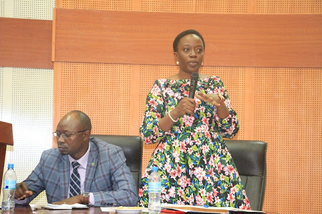 Kaimu Mkurugenzi Msaidizi wa Utawala Wizara ya Fedha na Mipango Bi. Gisela Mugumira akifafanua jambo wakati wa kikao na Watumishi wa Wizara hiyo (hawapo pichani), uliofanyika katika ukumbi wa Kambarage Jijini Dodoma, kushoto ni Kaimu Mkurugenzi wa Utawala na Rasilimali watu wa Wizara hiyo, Bw. Alfred Dede.