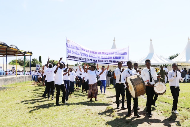 Baadhi ya wakunga wakiwa katika maandamano wakati wa Maadhimisho ya Siku ya Wakunga Duniani ambayo yamefanyika Kitaifa Mei 05, 2019 katika Uwanja wa Halmashauri ya Mji wa Bariadi Mkoani Simiyu.