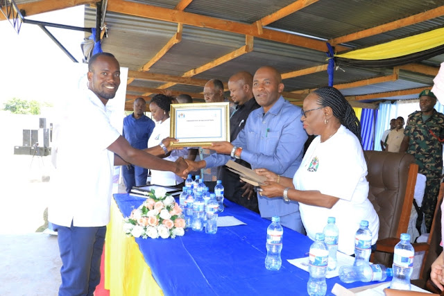 Naibu Waziri wa Afya, Maendeleo ya Jamii, Jinsia, Wazee na Watoto, Mhe. Dkt. Faustine Ndugulile akimkabidhi mmoja wa kunga wa moa wa Simiyu cheti kama zawadi ya kufanyakazi nzuri, katika Maadhimisho ya Siku ya Wakunga Duniani ambayo yamefanyika Kitaifa katika Uwanja wa Halmashauri ya Mji wa Bariadi Mkoani Simiyu.