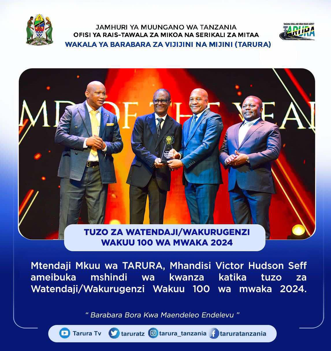 Mtendaji Mkuu wa Wakala ya Barabara za Vijijini na Mijini (TARURA) Mhandisi Victor H. Seff ameshinda  tuzo ya utendaji bora na kuwa miongoni mwa Watendaji  Wakuu 100 na kuwa kinara katika tuzo hizo kwa mwaka 2024, katika  kipengele cha Mtendaji Mkuu wa mwaka(CEO/MD of the year).