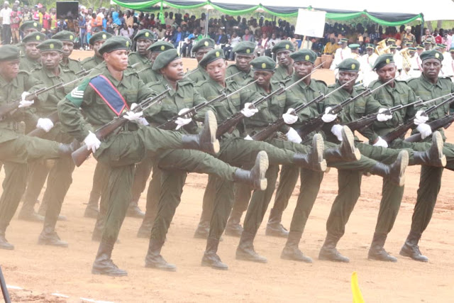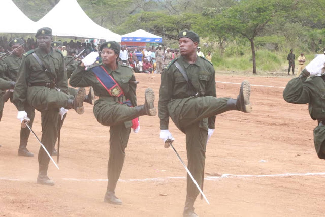 Pichani ni Gwaride kutoka Jeshi USU likiendelea kunogesha Uzinduzi wa Hifadhi za Ibanda na Rumanyika katika Shughuli ya Uzinduzi rasmi wa Hifadhi hizo uliofanyika Wilayani Kyerwa.