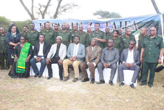 Pichani ni Picha ya pamoja ya Mgeni rasmi, Viongozi, pamoja na baadhi ya Watumishi wa TANAPA wakati wa Uzinduzi wa Hifadhi za Taifa za Ibanda na Rumanyika.