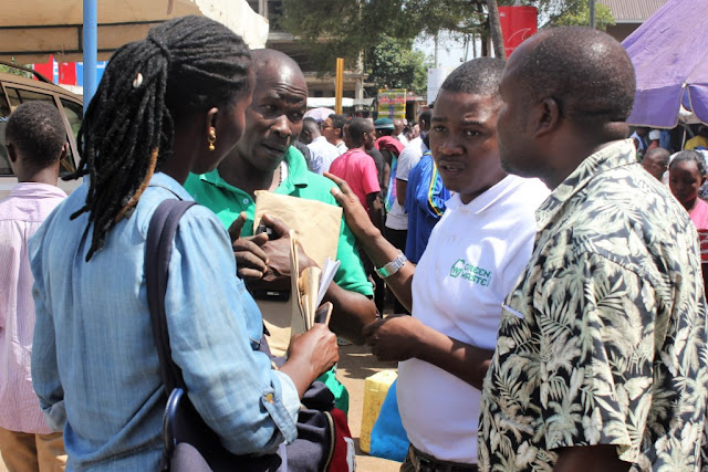 Meneja wa kampuni ya usafi ya GreenWastePro Kanda ya Ziwa, Salim Madafa (wa pili kulia) akiteta jambo na wadau wa mazingira jijini Mwanza wakati wa zoezi la kuhamasisha matumizi ya mifuko mbadala na kuachana na matumizi ya mifuko ya plastiki.