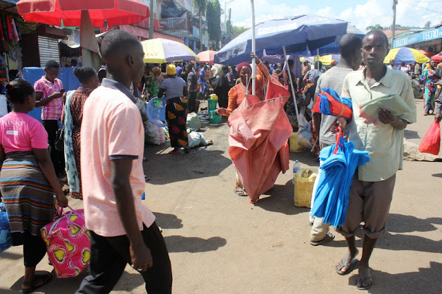Mmoja wa wafanyabiashara wadogo katika eneo la “Market Street” jijini Mwanza akiendelea na uuzaji wa mifuko mbadala.