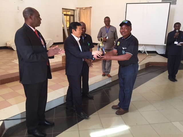 Kiongozi wa skimu ya kilimo cha umwagiliaji cha Mkombilenga iliyopo Wilayani Iringa katika kanda ya Umwagiliaji ya Mbeya Bw. Bwana Fundi Mihayo kaipokea kikombe toka kwa Mwakilishi Mkazi wa Shirika la Maendeleo la Kimataifa la Japan (JICA) Hapa nchini Bw.Nahofumi Yamamula baada ya skimu hiyo kushika nafasi ya kwanza katika Kongamano kubwa la kushindanisha vyama vya umwagiliaji lilofanyika jijini Dodoma.