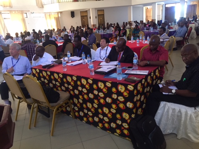Katikati Mwakilishi mkazi wa Shirika la kimataifa la maendeleo la Japan (JICA) nchini Bw. Nahofumi Yamamula , akiongea na katibu mkuu mstaafu wa Wizara ya Maji Mhandisi Mbogo Futakamba (kushoto) baada ya mapumziko wakati wa kongamano la kushindanisha vyama vya umwagiliaji lilofanyika Jijini Dodoma, Kulia ni Bw.Yoichi Yamauchi Mshauri wa Mradi wa kuwajengea uwezo wakulima katika eneo la umwagiliaji.