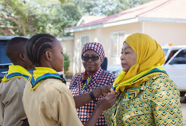 Makamu wa Rais wa Jamhuri ya Muungano wa Tanzania Mhe. Samia Suluhu Hassan akivishwa skafu na vijana wa skauti mara baada ya kuwasili wilayani Manyoni, kushoto ni Mkuu wa Mkoa wa Singida Mhe. Dkt. Rehema Nchimbi.