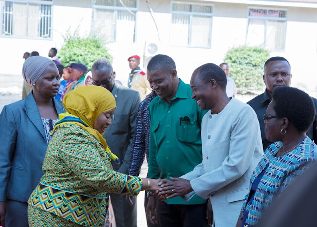 Makamu wa Rais wa Jamhuri ya Muungano wa Tanzania Mhe. Samia Suluhu Hassan akisalimiana na Mbunge wa Jimbo la Manyoni Mashariki Mhe. Daniel Mtuka mara baada ya kuwasili wilayani Manyoni tayari kwa ziara ya kukagua na kuhamasisha shughuli za kimaendeleo mkoani Singida