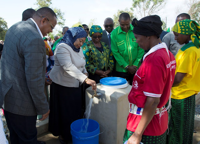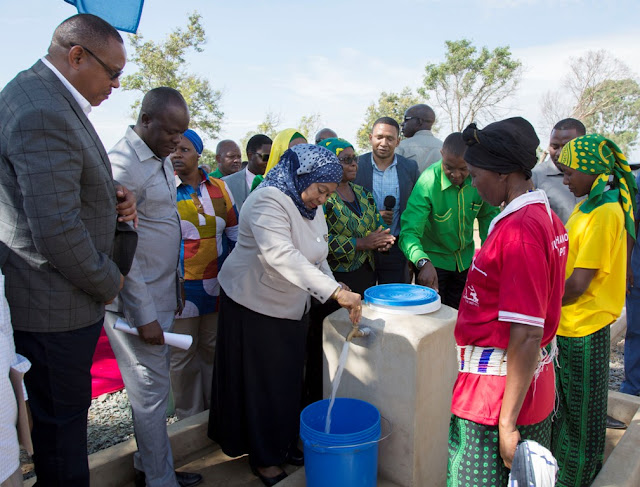 Makamu wa Rais wa Jamhuri ya Muungano wa Tanzania Mhe. Samia Suluhu Hassan akifungua maji kama ishara ya uzinduzi wa huduma ya maji katika kijiji cha Uliyampiti, Ikungi ambapo mradi huo utawanufaisha wakazi 2628. (Picha na Ofisi ya Makamu wa Rais)