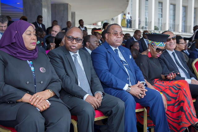 Makamu wa Rais wa Jamhuri ya Muungano wa Tanzania Mhe. Samia Suluhu Hassan akiwa na Naibu Waziri wa Wizara ya Mambo ya Nje na Ushirikiano wa Afrika Mashariki Mhe. Dkt Damas Ndumbaro pamoja na viongozi wengine wakati wa sherehe ya kumuapisha Rais mpya wa Jamhuri ya Kidemokrasia ya Congo katika uwanja mkuu wa michezo mjini Kinshasa