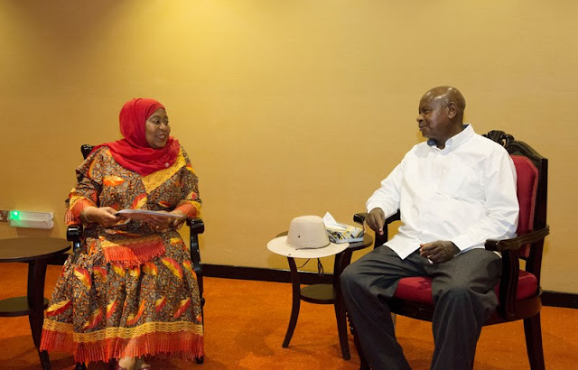 Makamu wa Rais wa Jamhuri ya Muungano wa Tanzania Mhe. Samia Suluhu Hassan amekutana na kufanya mazungumzo na Rais wa Uganda Mhe. Yoweri Kaguta Museveni mara baada ya kumalizika kwa mkutano wa Africa Now Summit 2019 katika hoteli ya Munyonyo Commonwealth Resort mjini Kampala, Uganda. (Picha na Ofisi ya Makamu wa Rais)