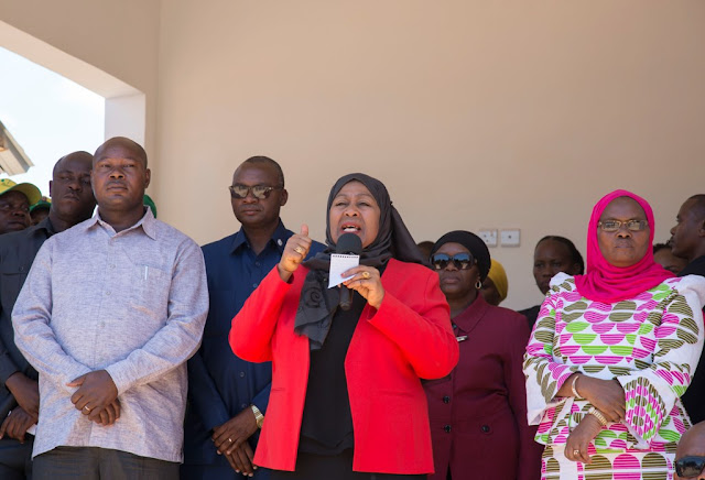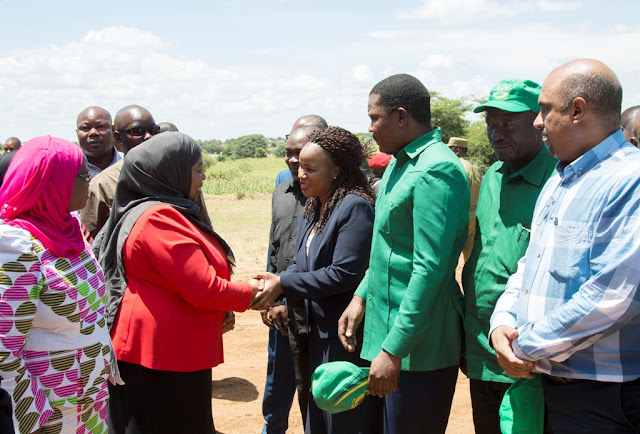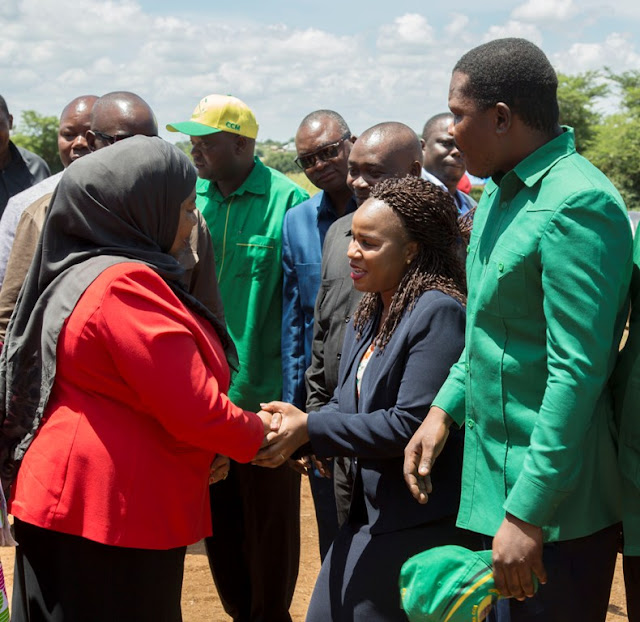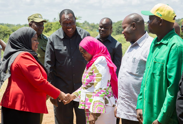 Makamu wa Rais wa Jamhuri ya Muungano wa Tanzania Samia Suluhu Hassan akisalimiana na Mkuu wa Wilaya ya Shinyanga Jasinta Mboneko (kulia) mara baada ya kuwasili katika kituo cha afya Samuye mkoani Shinyanga.