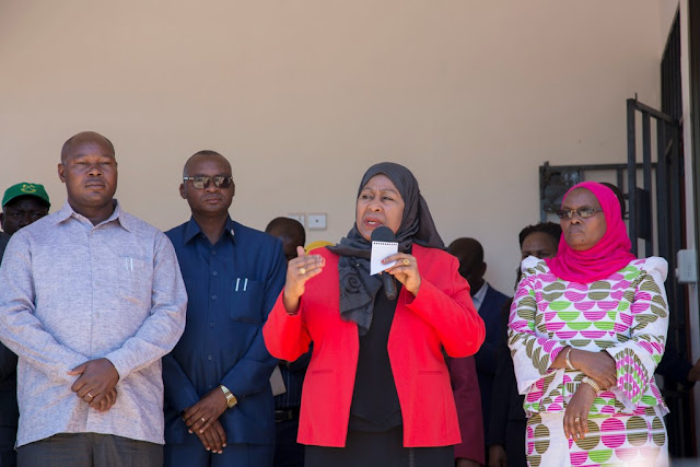 Makamu wa Rais wa Jamhuri ya Muungano wa Tanzania Samia Suluhu Hassan akisalimiana na Mkuu wa Mkoa wa Shinyanga Zainab Telack (kulia) mara baada ya kuwasili katika kituo cha afya Samuye mkoani Shinyanga. (Picha na Ofisi ya Makamu wa Rais)