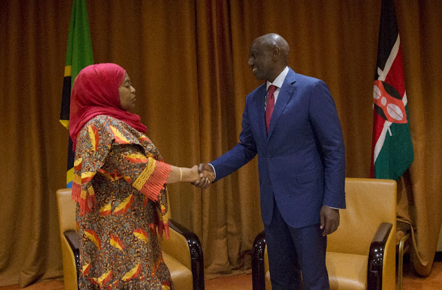 Makamu wa Rais wa Jamhuri ya Muungano wa Tanzania Mhe. Samia Suluhu Hassan akisalimiana na Naibu Rais wa Kenya Mhe. William Ruto kabla ya kufanya mazungumzo yao katika hoteli ya Munyonyo Commonwealth Resort, Kampala nchini Uganda ambapo kuna mkutano wa Africa Now Summit 2019. (Picha na Ofisi ya Makamu wa Rais)