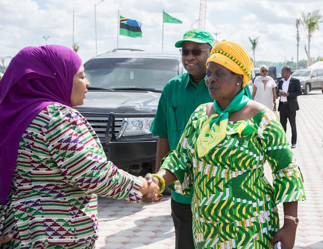 Makamu wa Rais wa Jamhuri ya Muungano wa Tanzania Mhe. Samia Suluhu Hassan akisalimiana na MWENYEKITI wa Umoja wa Wanawake wa Chama cha Mapinduzi Tanzania (UWT) Taifa, Gaudencia Kabaka ,wakati akiwasili kwenye Kongamano la Kumpongeza Dkt. Ali Mohammed Shein Rais wa Zanzibar na Makamu Mwenyekiti wa CCM Zanzibar katika uwanja wa Hoteli ya Verde, leo tarehe 16 Machi, 2019.