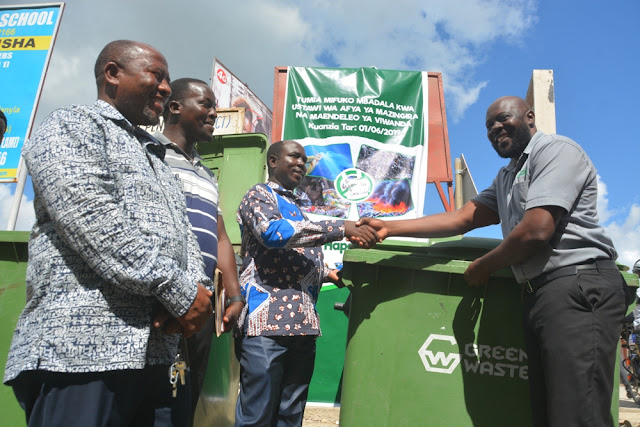 Meneja wa Mkuu wa Green Waste,Allan Sudi akimkabidhi Mkurugenzi wa Manispaa ya Kigamboni,Ng’wilabuzu Ludigija makasha ya kukusanya kata za mifuko ya plastiki kuunga mkono katazo la Serikalui la kupiga marufuku matumizi ya mifuko ya plastiki.