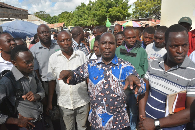 Mkurugenzi wa Manispaa ya Kigamboni,Ng’wilabuzu Ludigija (wa mbele) akiwa ambeamatana na watendanji wa Manispaa hiyo kuwaelimisha wananchi mwisho wa matumizi ya mifuko ya plastiki kuwa ni leo Mei 31, 2019,amesema ni marufuku kutengeneza, kuingiza, kuuza na kutumia mifuko ya plastiki kwa ajili ya kubebea bidhaa za aina yoyote katika Manispaa hiyo.Picha na Emmanuel Massaka wa Michuzi Tv)