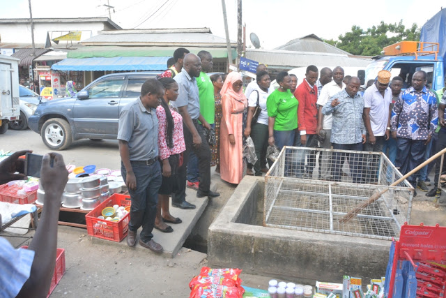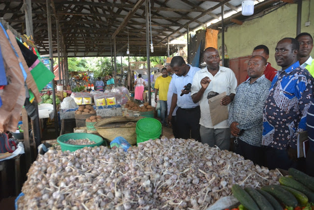 Mkurugenzi wa Manispaa ya Kigamboni,Ng’wilabuzu Ludigija (kulia) akiwa maeambana na watendanji wa Manispaa hiyo wakiangalia mifuko iliyopo katika soko kuu la kigambani na kuwapa elimu wanachi juu ya mwisho wa matumizi ya mifuko ya plastiki ni leo Mei 31, 2019.