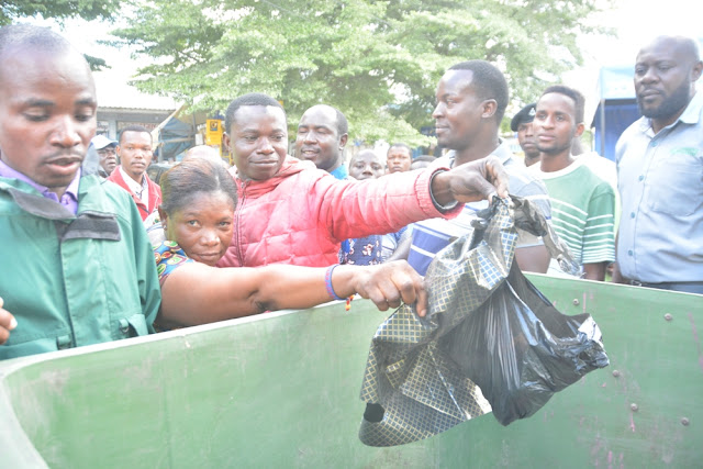 Wananchi wakiweka mifuko ya plastiki katika makasha ya kukusanya kata.