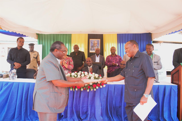 Mwenyekiti wa Bodi ya Mamlaka ya Majisafi na Usafi wa Mazingira ,Moshi aliyemaliza muda wake ,Prof Faustine Bee (kulia ) akikabidhi nyaraka za Bodi hiyo kwa Mwenyekiti Mpya wa Bodi ya MUWSA ,Prof  Jafari Kidegesho mara baada ya Waziri kuizundua rasmi mjini Moshi