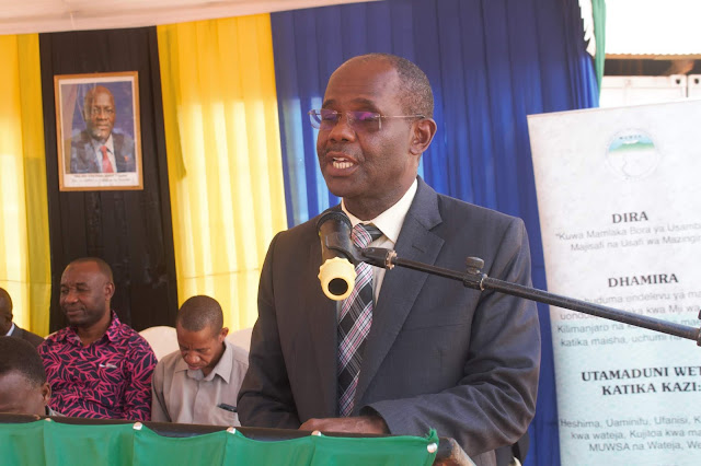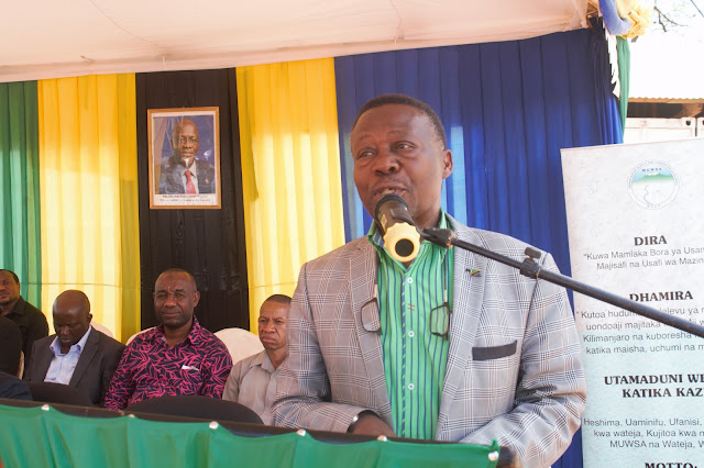 Katibu Mkuu Wizara ya Maji,Prof Kitila Mkumbo akizungumza wakati wa kutamburisha wajumbe wapya wa Bodi ya Mamlaka ya Majisafi na Usafi wa Mazingira mjini Moshi (MUWSA)