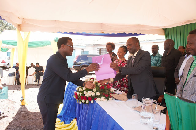 Waziri wa Maji na Umwagiliaji ,Prof Makame Mbarawa akikabidhi vitendea kazi kwa katibu wa Bodi mpya ya Mamlaka ya Majisafi na Usafi wa Mazingira ,(MUWSA) ,Mhandisi Aron Joseph ambaye pia ni Mkurugenzi Mtendaji wa Mamlaka hiyo .Hafla ya uzinduzi wa Bodi hiyo umefanyika zilipo ofisi za MUWSA