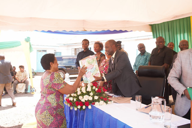 Katibu wa Bodi ya Wakurugenzi ya Mamlaka ya Majisafi na Usafi wa Mazingira mjini Moshi ,Joyce Msiru ambaye alikuwa Mkurugenzi wa Mamlaka hiyo ,akipokea zawadi kutoka kwa Waziri wa Maji,Prof Makame Mbarawa mara baada ya Bodi hiyo kumaliza muda wake.