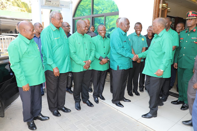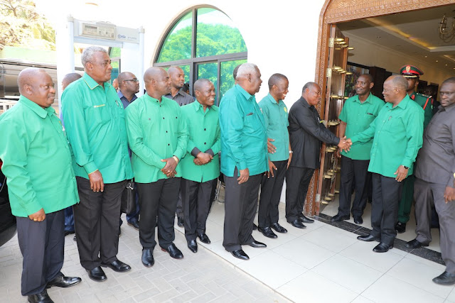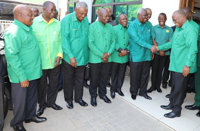 Mwenyekiti wa Chama Cha Mapinduzi na Rais wa Jamhuri ya Muungano wa Tanzania Dkt. John Pombe Magufuli akiagana na wajumbe wa Kamati Kuu ya Halmashauri Kuu ya CCM baada ya kikao kilichofanyika Ofisi ndogo za Chama hicho mtaa wa Lumumba jijini Dar es salaam leo Oktoba 30, 2019. PICHA NA IKULU