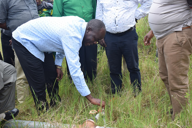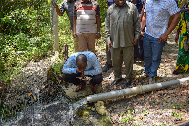 Naibu Waziri wa Maji Jumaa Aweso akiyaonja maji yanayotoka katika chanzo cha maji asilia kitakachopeleka maji kwenye tanki linalohifadhi maji Lita Milion 1.5 lililopo kwenye hatua ya ujenzi litakalohudumia wakazi 25,000.