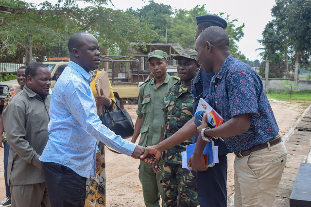 Naibu Waziri wa Maji Jumaa Aweso akisalimiana na Katibu wa Mbunge wa Mkuranga Abdallah Ulega, Omar Kisatu baada ya kuwasili ofisi ya Mkuu wa Wilaya Mkuranga leo.