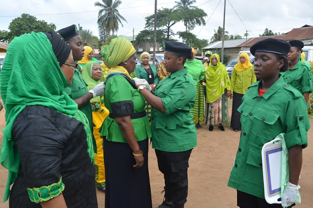 MWENYEKITI wa Umoja wa Wanawake wa Chama Cha Mapinduzi Tanzania (UWT) Gaudensia Kabaka akivishwa sikafu na Vijana wa Kikundi Maalum cha UVCCM Wilaya ya Dimani Kichama Unguja mara baada ya kuwasili katika Afisi za Wilaya hiyo kwa ajili ya ziara.