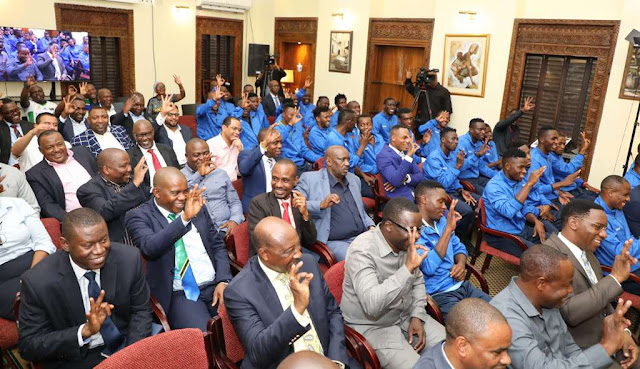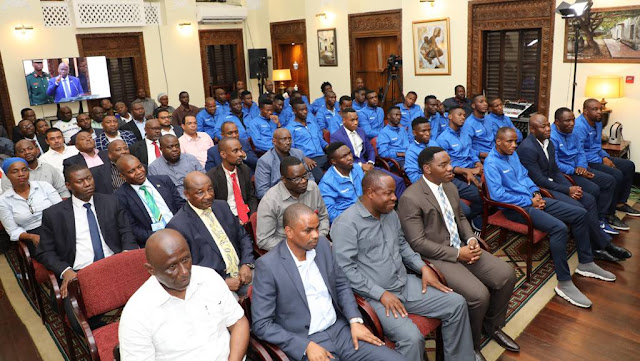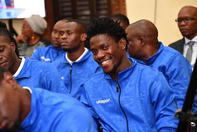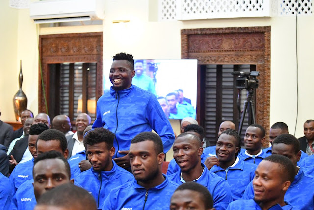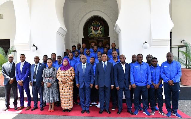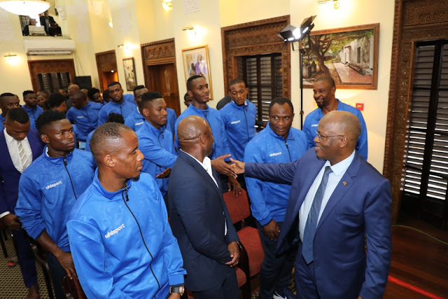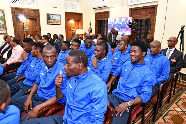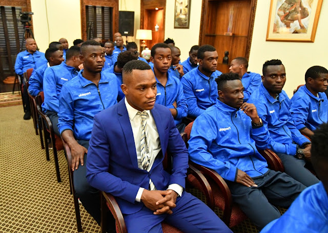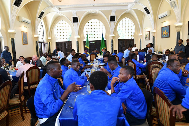 Rais wa Jamhuri ya Muungano wa Tanzania Dkt. John Pombe Magufuli akiwa anapata chakula cha mchana na viongozi pamoja na Wachezaji wa timu ya Taifa ya Tanzania Taifa Stars Ikulu jijini Dar es Salaam.