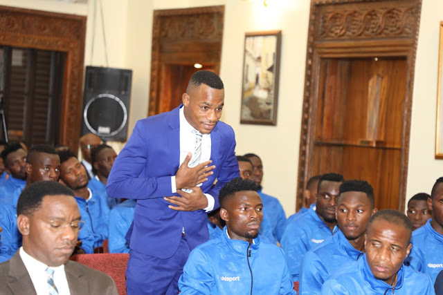 Mfungaji wa goli la pila la Taifa Stars zidi ya Uganda Erasto Nyoni akijitambulisha Ikulu jijini Dar es Salaam.