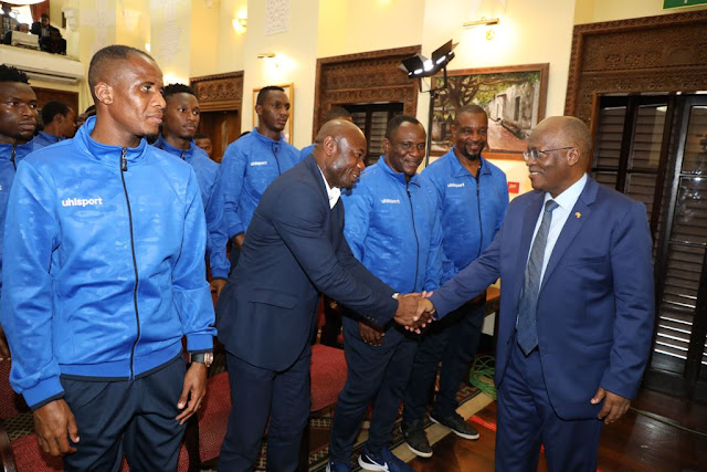 Rais wa Jamhuri ya Muungano wa Tanzania Dkt. John Pombe Magufuli akisalimiana na Kocha wa Taifa Stars Emanuel Amunike mara baada ya kumaliza kuzungumza na wachezaji wa Timu ya Taifa.