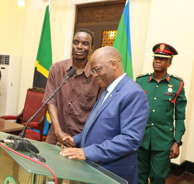 Rais wa Jamhuri ya Muungano wa Tanzania Dkt. John Pombe Magufuli akimsikiliza Mchezaji wa zamani wa Timu ya Taifa ya Tanzania Taifa Stars Peter Tino ambaye alifunga goli moja lililoipeleka Tanzania kwa mara ya kwanza katika michuano ya AFCON mwaka 1980 iliyofanyika nchini Nigeria. Pia Rais Dkt. Magufuli amemsaidia mchezaji huyo wa zamani kiasi cha Shilingi milioni tano.