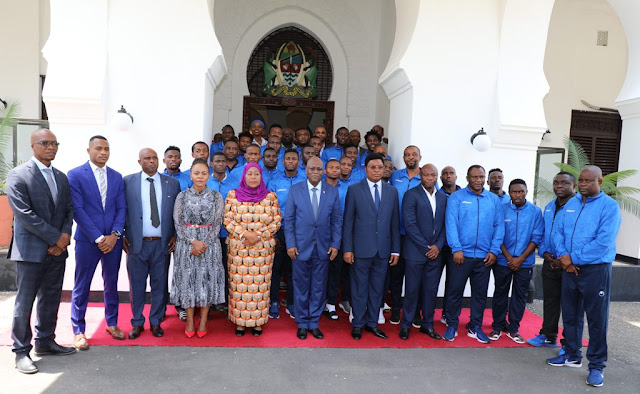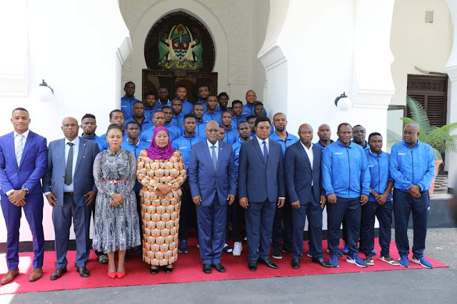 Sehemu ya Wachezaji wa wa timu ya Taifa ya Mpira wa Miguu Taifa Stars waliopo upande wa kulia pamoja na viongozi wengine wakiwa katika ukumbi wa Mkutano Ikulu jijini Dar es Salaam.