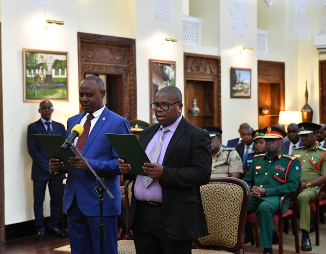 Naibu Katibu Mkuu wa Wizara ya Fedha na Mipango (Sera) Adolf Ndunguru akiwa pamoja na Naibu Kamishna Mkuu wa Mamlaka ya Mapato Tanzania (TRA) wakati wakila Kiapo cha Uadilifu  Ikulu jijini Dar es Salaam.