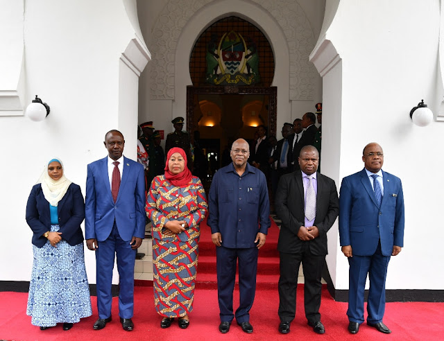 Rais wa Jamhuri ya Muungano wa Tanzania Dkt. John Pombe Magufuli akiwa katika picha ya kumbukumbu na Makamu wa Rais Samia Suluhu Hassan, Katibu Mkuu Kiongozi Balozi wa John Kijazi, Naibu Waziri wa Fedha na Mipango Dkt. Ashatu Kijaji wakwanza kushoto Naibu Katibu Mkuu wa Wizara ya Fedha na Mipango (Sera) Adolf Ndunguru  wapili kutoka kulia Naibu Kamishna Mkuu wa Mamlaka ya Mapato Tanzania (TRA) Msafiri Mbibo wapili kutoka kushoto mara baada ya tukio la uapisho Ikulu jijini Dar es Salaam. PICHA NA IKULU