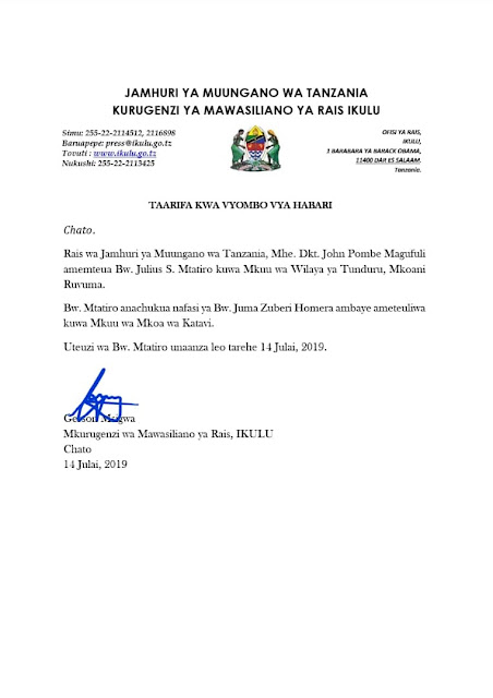 RAIS MAGUFULI AMEMTEUA JULIUS MTATIRO KUWA MKUU WA WILAYA TUNDURU