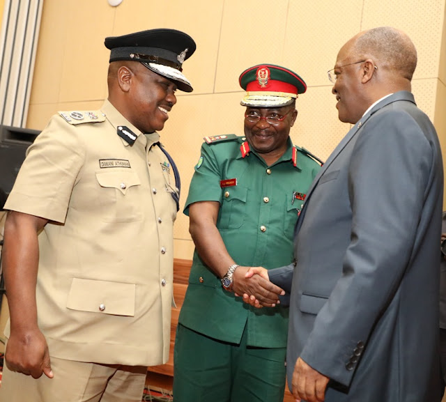 Rais wa Jamhuri ya Muungano wa Tanzania Dkt. John Pombe Magufuli akiteta jambo na Mkurugenzi Mkuu wa Taasisi ya Kuzuia na Kupambana na Rushwa (TAKUKURU) Kamishna Diwani Athumani na Naibu wake Brigedia Jenerali John baada ya kumuapisha Kamishna Valentino Longino Mlowola kuwa Balozi wa Tanzania nchini Cuba na kupokea Ripoti ya Utendaji Kazi wa TAKUKURU kwenye hafla iliyofanyika Ikulu jijini Dar es salaam Alhamisi Machi 28, 2019.