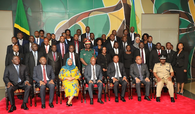 Rais wa Jamhuri ya Muungano wa Tanzania Dkt. John Pombe Magufuli katika picha ya kumbukumbu na Makamu wa Rais Mhe. Samia Suluhu Hassan, Waziri Mkuu Mhe Kassim Majaliwa, Jaji Mkuu Profesa Ibrahim Juma, Mkurugenzi Mkuu wa Taasisi ya Kuzuia na Kupambana na Rushwa (TAKUKURU) Kamishna Diwani Athumani na Naibu wake Brigedia Jenerali John Mbungo pamoja na Kamishna Valentino Longino Mlowola baada ya kumuapisha kuwa Balozi wa Tanzania nchini Cuba na kupokea Ripoti ya Utendaji Kazi wa TAKUKURU pamoja na Makamanda wa Mikoa Yote na Maafisa Waandamizi wa TAKUKURU kwenye hafla iliyofanyika Ikulu jijini Dar es salaam Alhamisi Machi 28, 2019.
