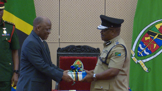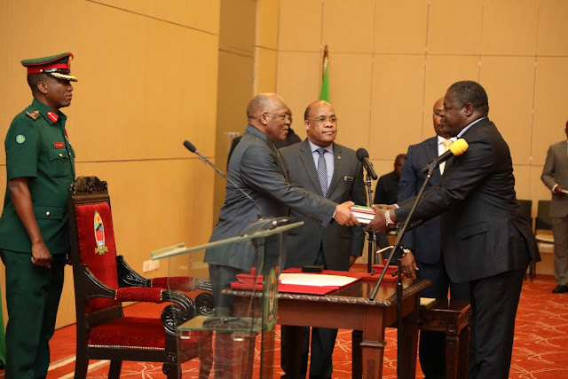 Rais wa Jamhuri ya Muungano wa Tanzania Dkt. John Pombe Magufuli akimkabidhi vitendea kazi baada ya kumuapisha Kamishna Valentino Longino Mlowola kuwa Balozi wa Tanzania nchini Cuba kwenye hafla iliyofanyika Ikulu jijini Dar es salaam Alhamisi Machi 28, 2019.