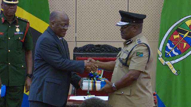 Rais wa Jamhuri ya Muungano wa Tanzania Dkt. John Pombe Magufuli akipeana mikono na Mkurugenzi Mkuu wa Taasisi ya Kuzuia na Kupambana na Rushwa (TAKUKURU) Kamishna Diwani Athumani na akiwa na Naibu wake Brigedia Jenerali John Mbungo pamoja na Kamishna Valentino Longino Mlowola baada ya kumuapisha kuwa Balozi wa Tanzania nchini Cuba na kupokea Ripoti ya Utendaji Kazi wa TAKUKURU kwenye hafla iliyofanyika Ikulu jijini Dar es salaam Alhamisi Machi 28, 2019.