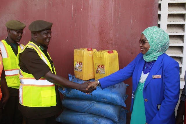 Katibu Tawala wa Mkoa wa Tanga Mhandisi Zena Said kulia akigawa sehemu ya bidhaa ambazo zilikamatwa na kutaifishwa mara baada ya wamiliki wake kushindwa kukamilisha taratibu za forodha ambazo ni sukari mifuko 278 na mafuta ya kupikia madumu 1241na hivyo kamisha wa Idara ya forodha na Ushuru wa Bidhaa ameamua kutoa kama msaada kwa taasisi mbalimbali hususani vituo vya watoto,wazee na watu wenye mahitaji maalumu na magereza kwa mkuu wa Magereza Mkoa wa Tanga Kamisha Msaidizi wa Jeshi la Magereza Emanuel Lwenga